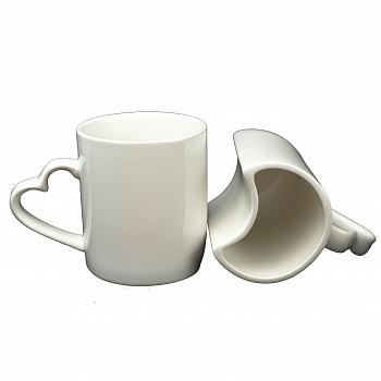 Парные кружки под сублимационную печать. Ручки выполнены в форме сердечек, а сами кружки вместе совмещаются друг с другом. При этом одна кружка обычная, круглая, а вторая имеет углубление. Нанесение изображения, фотографии или какой либо другой картинки возможно на обе кружки при помощи стандартной насадки кружечного термопресса. Кружки для двоих на которых возможно нанесение качественных надписей и фото, как правило такой вариант выбирают влюбленные и семейные пары. Можно их объединить единым дизайном или сделать двумя половинками одного целого, зависит от фантазии дизайнера или заказчика. Оригинальный дизайн ручек придает пикантности и выгодно отличает их от других вариантов. Комплект из двух штук.