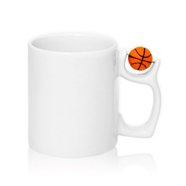 Сублимационная кружка с фигурной ручкой и баскетбольным мячом. Такой вид кружек оценят болельщики и любители спорта, сублимационное покрытие позволяет наносить стойкие, яркие изображения, надписи, фото и т.д.