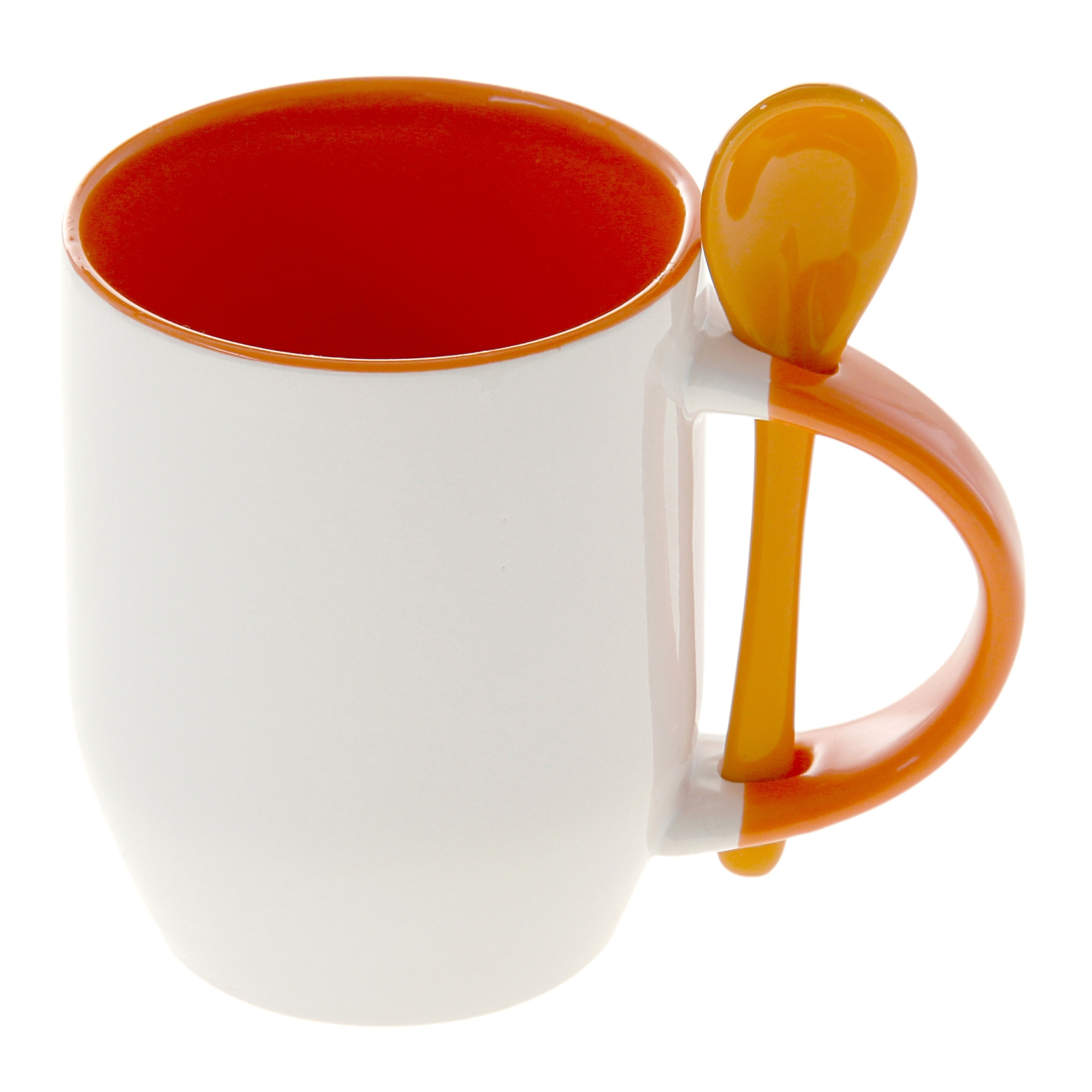 Белая кружка с цветной внутренней поверхностью и ложкой, вставляющейся в ручку для полноцветной запечатки поверхности. Приобретается как индивидуальный подарок, так и корпоративный, коллективный (дет.сады, школы) презент, кроме этого можно использовать в рекламных целях.