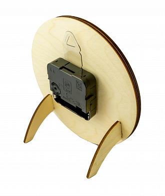Деревянные часы на ножках под полиграфическую вставку. Основание часов двухслойное, круглое выполнено из дерева, держит упор за счет опоры на две деревянные ножки расположенные сзади.